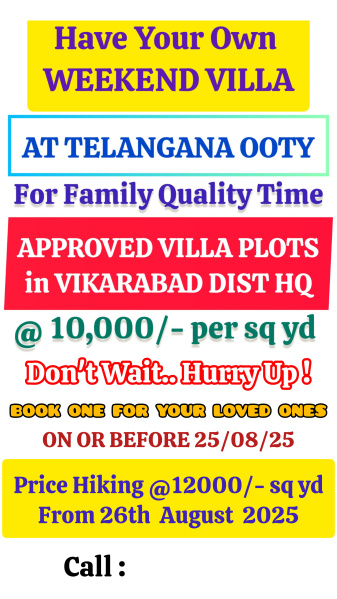 THE PRELAUNCH EXOTIC EVER OFFER AVAIL THE THE OPPORTUNITY TO BUILT YOUR WEEKEND VILLA IN JUST RS.10,000 PER SQUARE YARD LATER STAGE AFTER GETTING HMDA' APPROVAL THE PRICE WILL BE INCREASED *SILVER SPACE, Smart City, Vikarabad* - _Auspicious Project in Alluring Location by Asia's Greatest enchanting unforgettable Brand Shathabdhi Townships Pvt. Ltd. for Very Reasonable Price_ Rs.10,000 Per square yard, SUITABLE FOR WEEKEND TO BUILT ESPECIALLY WEEKEND VILLA AND FOR YOUR PRECIOUS INVESTMENT WILL BRINGS LATER ON ,IN A VERY SHORT TIME YOU WILL GET FABULOUS RETU S , AND WE ALREADY WE APPLIED FOR HMDA APPROVAL AFTER GETTING HMDA APPROVAL IN AUGUST 2025 ?? *DTCP APPROVED LAYOUT with L.P. No.* ?? *SPOT REGISTRATION* ?? *DISTRICT HEAD QUARTERS* ?? *SMART CITY* ?? *CONNECTIVITY BENEFITS :* 4 Kms from _Vikarabad Main Centre_ 5 Kms from _Vikarabad Railway Station_ 26 kms from _RRR / Mehtab Khan Guda Junction_ 37 Kms from _Highly Developed Shankarpally Town_ 64 Kms from _Financial District / ORR_ ?? *LOCATION HIGHLIGHTS :* Located in Free Zone Well Connected to RS & T5 Terminals (Rail & Road Transportation) Very Close to Existing 150 Feet Road from Sadashivpet to Tandur Close to Proposed 200 Feel - 4 Lane National Highway Passing from Manneguda Close to Existing 100 Feet Road from Shankarpally to Mominpet Close to Areas/Land Banks of MNCs such as PHOENIX, GVK, INCOR, APPOLLO etc. Well Connected to Finance District & HItech City in 60 to 70 Min Drive..